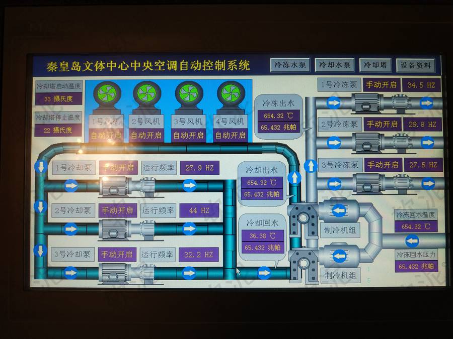 | 項(xiàng)目位于秦皇島市海港區(qū)建設(shè)大街東段37號(hào)。共6臺(tái)變頻器控制6個(gè)水泵。8個(gè)傳感器,包括冷凍水供水溫度壓力和回水溫度壓力、冷卻水供水溫度壓力和回水溫度壓力,4個(gè)接觸器控制4個(gè)冷卻塔風(fēng)機(jī)運(yùn)行。在滿足預(yù)設(shè)溫度壓力需求前提下自動(dòng)降低頻率,節(jié)能運(yùn)行。使用軟泥智能控制主機(jī)的4G聯(lián)網(wǎng)控制功能,管理人員通過手機(jī)即可遠(yuǎn)程查看設(shè)備運(yùn)行狀態(tài),遠(yuǎn)程開關(guān)機(jī)和設(shè)置運(yùn)行需求。 |
